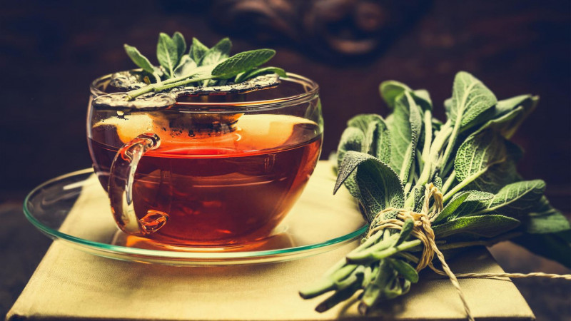 ➝ Einen Teelöffel getrocknete Salbeiblätter mit einem halben Liter kochendem Wasser übergießen.