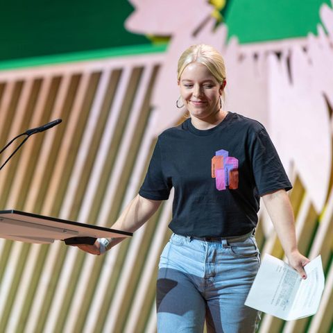 Mehr Applaus aber bekommt eindeutig ihr Co-Vorsitzender Jakob Blasel bei seiner Verabschiedung. Der 24-Jährige bekannte Klimaaktivist macht mehr inhaltliche Punkte. Ihn mache wütend, wie die Grünen absehbar in die Situation gelaufen seien, dass sie bei der vergangenen Bundestagswahl bei jungen Leuten so schlecht abgeschnitten haben, er spricht über den seiner Meinung nach "rassistischen Zehn-Punkte-Plan" der Grünen zur Migration in der Endphase des Wahlkampfs, und davon, dass Klimaschutz zwar eine soziale Frage sei, aber dass man Verbrenneraus und Heizungsgesetz nur einfordern könne, wenn klar sei, wer dafür bezahle. Er spricht von einer "Feigheit" der grünen Politik, die sich nicht mehr traue, sich mit den wahren Verursachern der Krisen anzulegen. All diese Punkte quittiert der Saal mit viel Applaus.