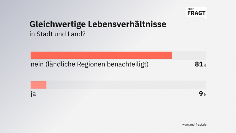 Trotz der persönlichen Zufriedenheit: Auf politischer Ebene sehen die meisten Befragten den ländlichen Raum benachteiligt. Acht von zehn Befragten (81%) finden nicht, dass es gleichwertige Lebensverhältnisse zwischen Stadt und Land gibt. Genau das ist aber ein wichtiges politisches Ziel. Thüringen und Sachsen-Anhalt haben es sogar in ihre Landesverfassungen aufgenommen. Gleichwertige Lebensverhältnisse: darüber gab es zuletzt viele Debatten und 2024 sogar einen umfangreichen Bericht der Bundesregierung. Für die MDRfragt-Gemeinschaft ist dieses Ziel bei weitem nicht erreicht.