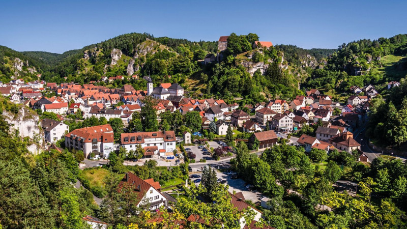 Mit dem Zug ist Pottenstein von Berlin aus knapp sechs Stunden zu erreichen, mit dem Auto in 4,5 Stunden. Nürnberg und Bayreuth sind jeweils etwa eine Stunde entfernt © Mauritius Images