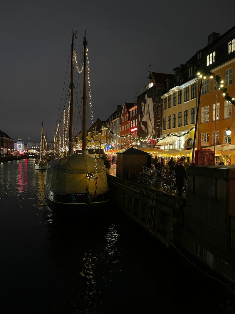 Nur wenige Schritte weiter erleuchtet der einstige Handelshafen von Kopenhagen in einem Lichtermeer. Bunte alte Häuser und in fast jedem wartet eine Kneipe oder ein Restaurant. Früher wohnten viele Künstler in den Häusern. Hans Christian Andersen lebte unter anderem im Haus mit der Nr. 20 und schrieb dort Märchen wie "Das Mädchen mit den Streichhölzern". In der Adventszeit stehen die Weihnachtsmarkthütten direkt an der Kaimauer. Auch hier können warme Handschuhe, Mützen, Gløgg oder die eine oder andere Leckerei gekauft werden.